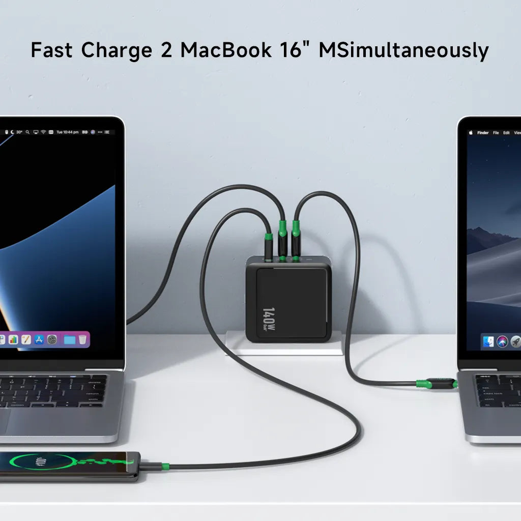 Charge the 16-inch MacBook Pro to 56% in 30 minutes;Wide Compatibility for 3-in-1 Multiport Charger; Powered by GaN+ tech, it reduces its size by 22% compared to the original 140W power adapter.