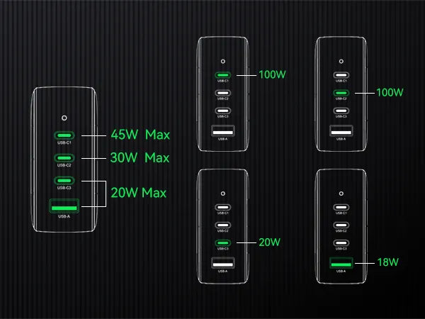 ▪ Max 100W Fast Charging: The USB C Charger Block with 3 USB-C ports and 1 USB-A port, connect a single USB C device to get maximum output 100W, charge your MacBook Pro 16'' to 50% in 30 minutes.