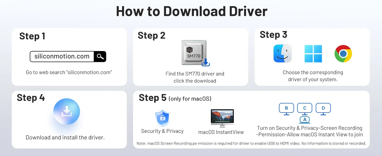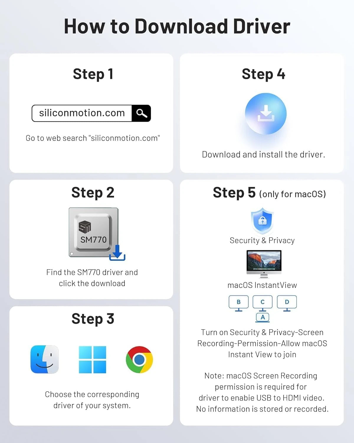 • True triple 4K display for Mac and Windows: Expand your screen space. This dock supports up to three independent 4K@60Hz monitors on compatible macOS and Windows systems, delivering crisp, lag-free visuals—ideal for creative work, programming, trading, and multitasking. Connect via USB-C, USB4, or Thunderbolt for broad laptop compatibility. Note: Drivers must be installed in advance before using the video port.